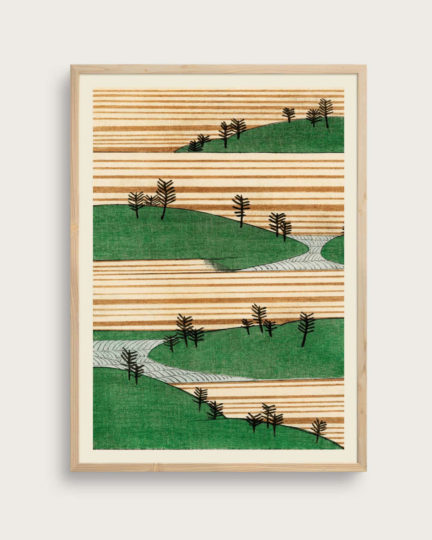 Landskab med bakker japansk print af Watanabe Seitei Japansk print med et stiliseret landskab bestående af grønne bakker, en snoet sti og små træer gengivet i enkle former. Motivet er opbygget i horisontale felter med gentagende linjer og rolige farver.