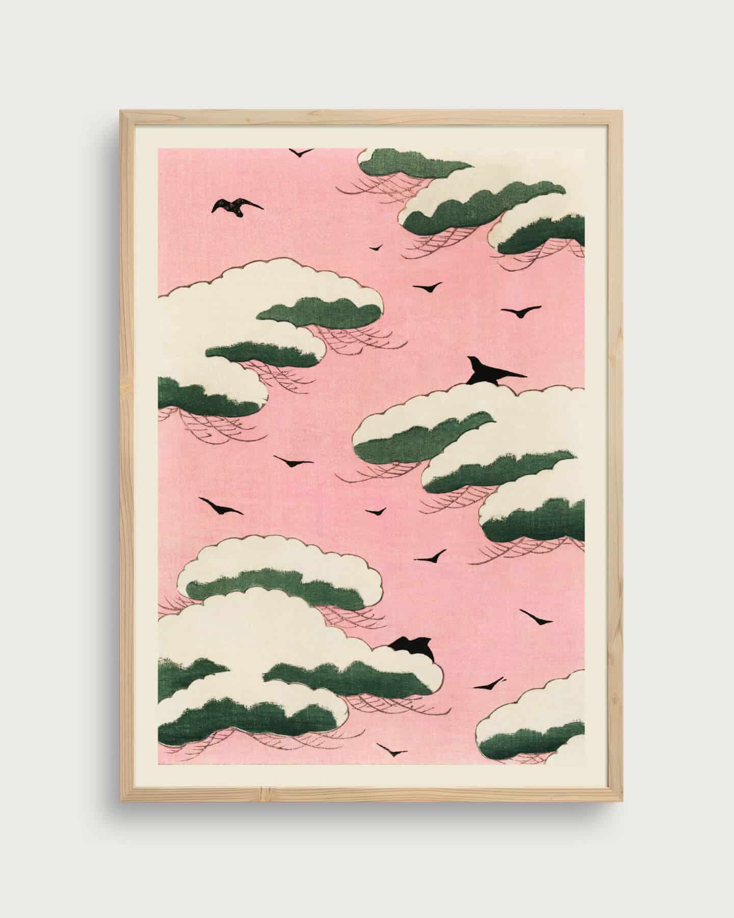 Pink Sky japansk print af Watanabe Seitei Japansk print med lyserød himmel, hvide og grønne skyer samt små, sorte fugle gengivet i enkle, grafiske former. Motivet hviler mod en lys baggrund og fremstår klart og roligt i sin farvepalette. Motivet er skabt