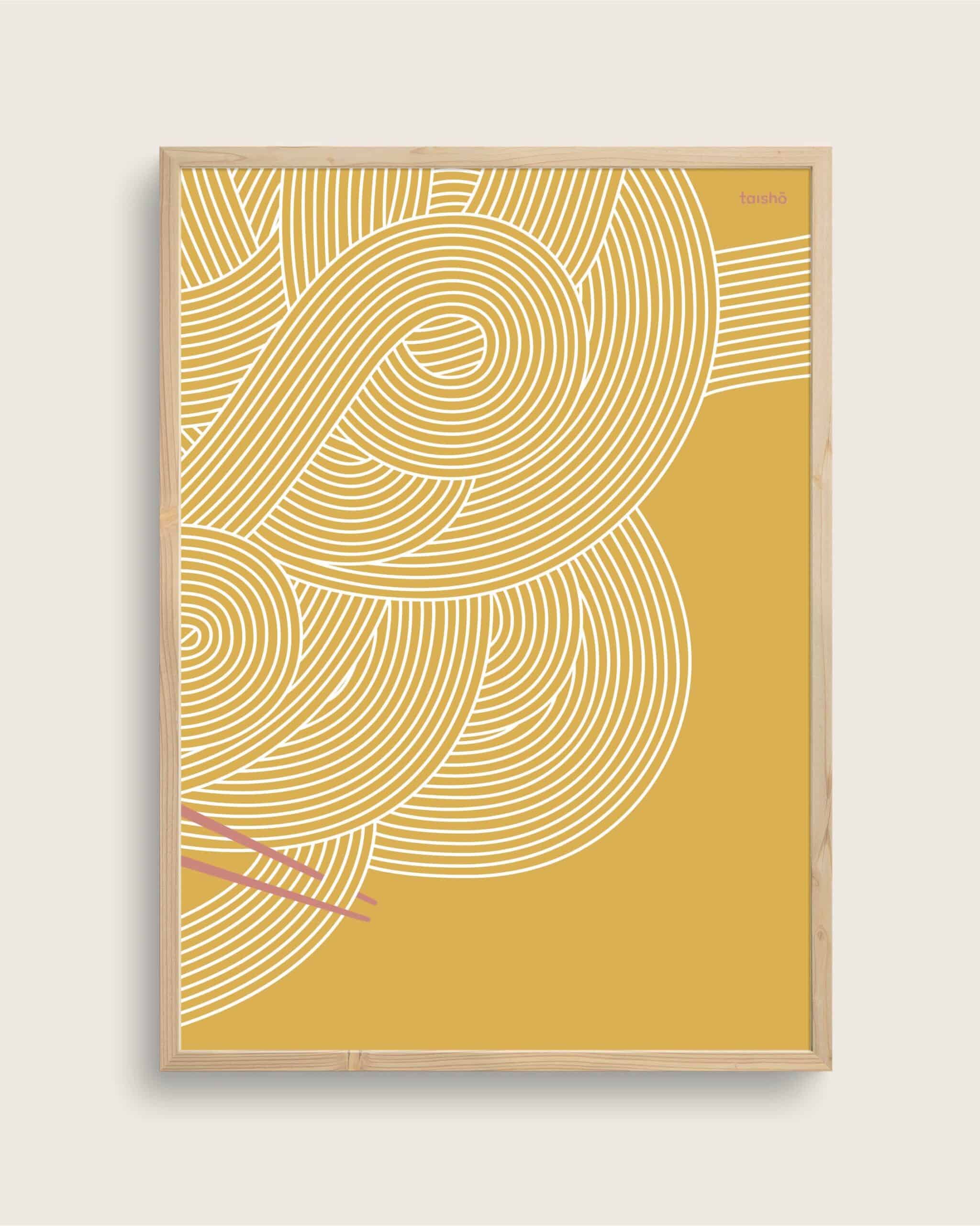 Udon #2 er designet digitalt og har et mere grafisk udtryk. Udon er en tyk japansk nudeltype med en fin blød konsistens og en ligeså fin blød kurve. Printes på 240g mat kvalitetspapir eller 400g canvaslærred Findes i 5 farvevarianter og 7 standardstørre